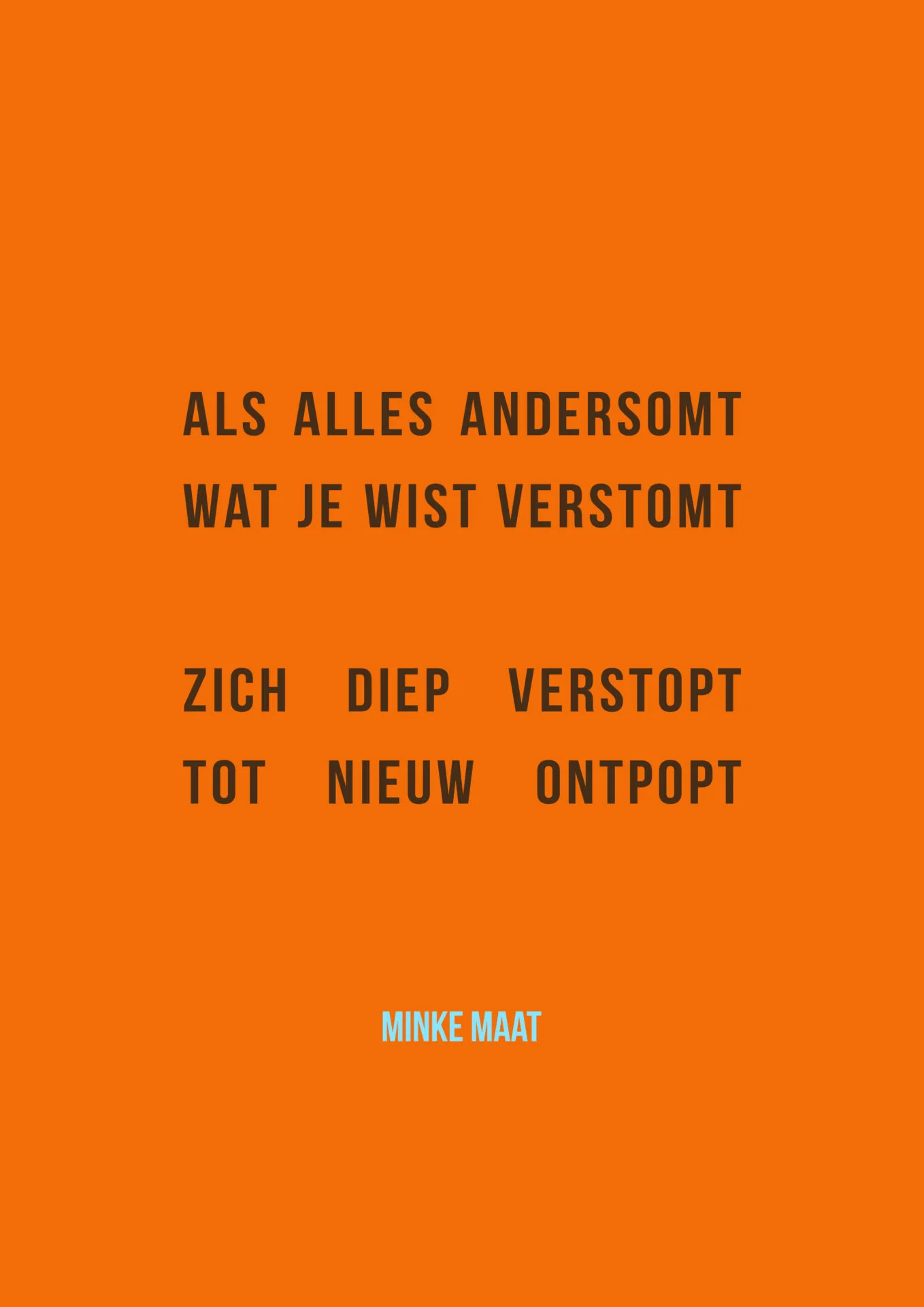 Het gedicht dat ik zelf alvast met metamorfose on my mind schreef is tijdens de Poëzieweek te zien op de Hilversumse gevels, wanneer OutSpoken035 gedichten van dichters uit heel Nederland de straten laat verlichten. Kom je kijken?! En woon je verder naar het zuiden, dan komt in het gemeentehuis van Weert een van mijn gedichten op A3-formaat te hangen tijdens deze week!