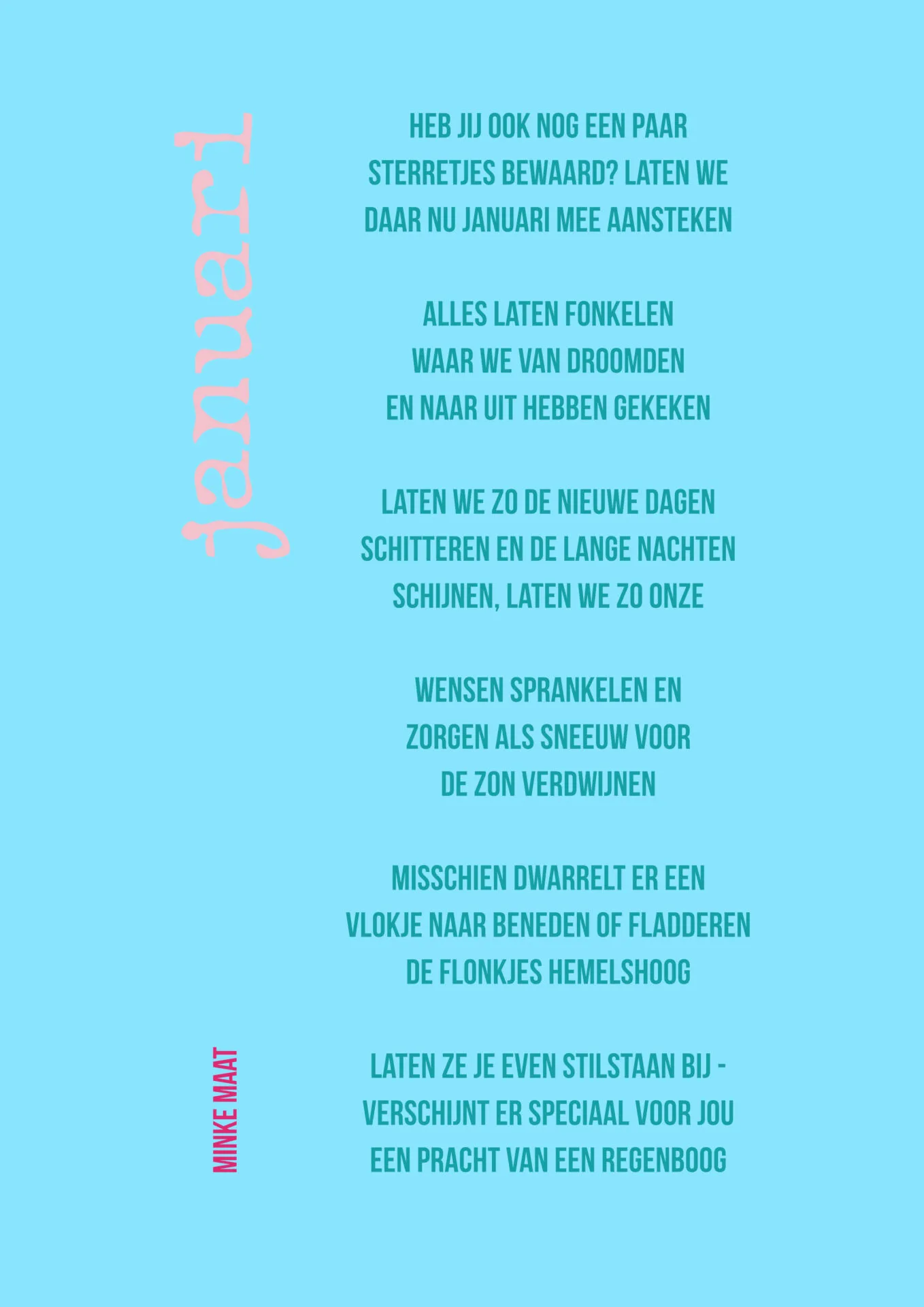 Een gedicht op maat voor de eerste maand van het jaar: JANUARI! De maand waarin we steeds wat dagen verder komen van de kortste dag en het misschien wel vlokjes laat dwarrelen. We beginnen misschien opnieuw voor ons gevoel en kijken uit naar …