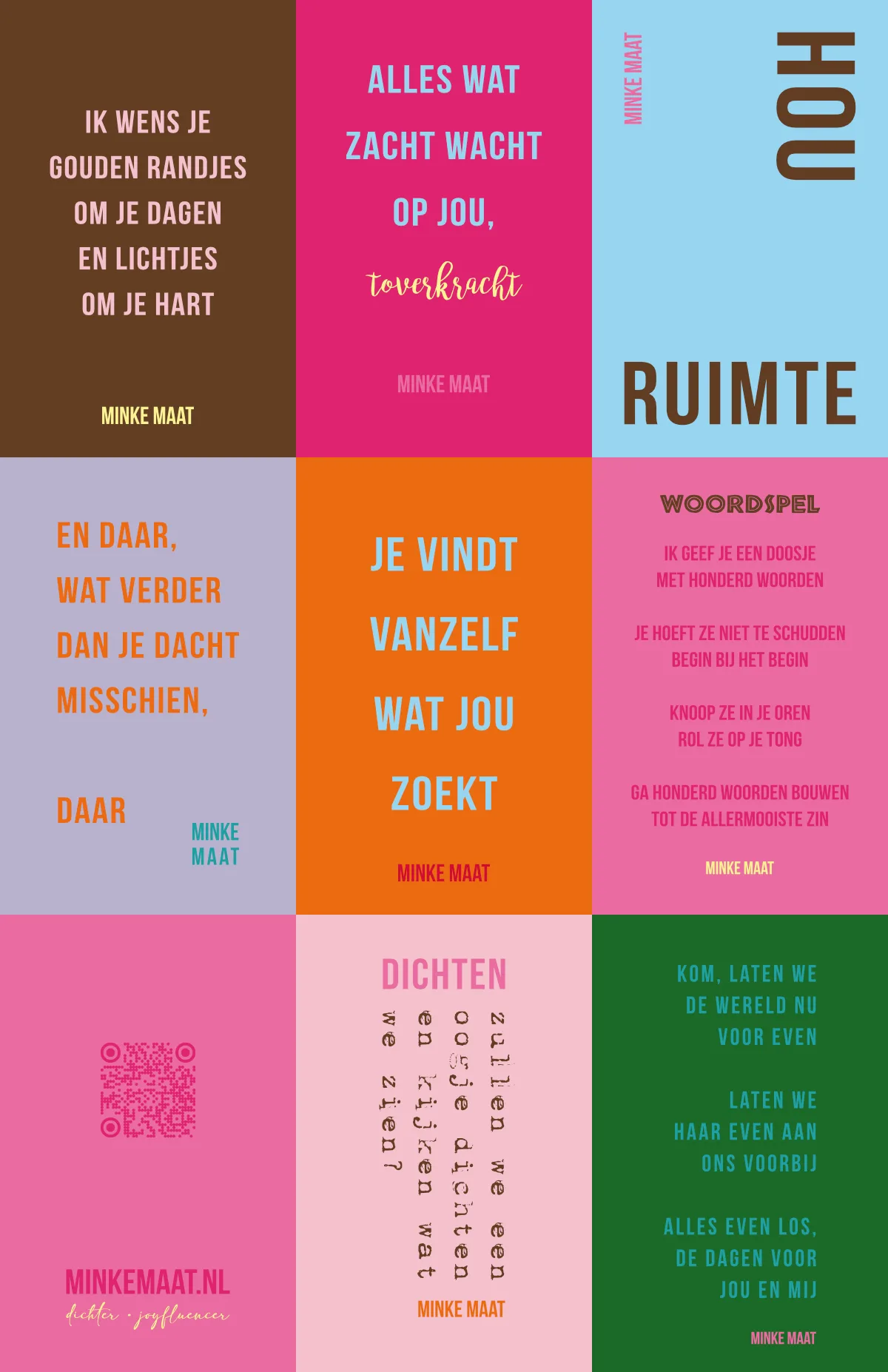 Acht kleine kaartjes met verschillende korte teksten in verschillende thema’s. De kleurige kaartjes hebben het formaat van een visitekaartje en zijn 8,5 x 5,5 cm. Ze voelen zacht en stevig aan door het 350 grams soft touch papier en je kunt er alle kanten mee op. Verpakt in een mooi organza-zakje. Hou je ze voor jezelf of deel je ze uit of EN EN?!